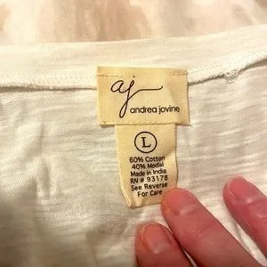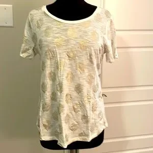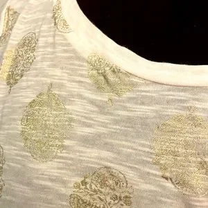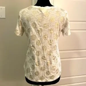 This shirt is like new, only worn a couple of times. Somewhat sheer material in an off-white with metallic gold medallions appliquéd.