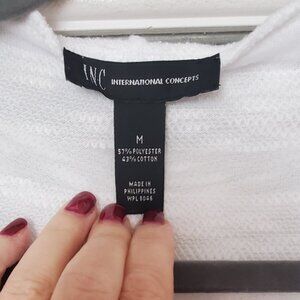 Like new white v neck blouse with a hood & elastic waist. Size Medium. 57% polyester, 43% cotton. See through, I wear a white tank top underneath it.