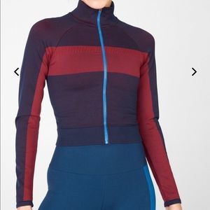 fitted, two-tone jacket has a cropped length and mock-neck collar. Add a contrast zipper, and you have a form-flattering layer to take you to and from the studio in sporty style.