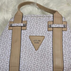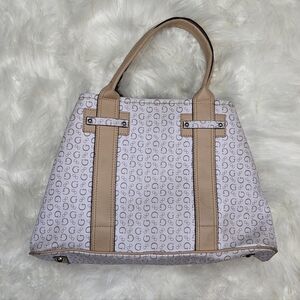 Like-New Guess Logo White Vegan Leather Shoulder Tote with Tan Handle and Trim