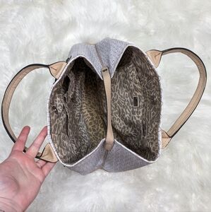 Logo, Bag, Purse, Tote Bag, Vegan Leather, Faux Leather, PVC, Polyurethane, Guess, Guess Logo, Tote Bag, Shoulder Bag, White, Tan, Brown, Cream, Polyester, Lined, 100% Polyester, 100% Polyurethane, Convertible, Versatile, Animal Print Lining, Large Tote, Authentic, Allover Print, Allover Logo
