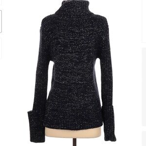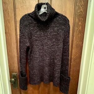 This chunky, metallic knit sweater from Trouvé is a sort of purple-blue-black depending on the light and what you pair it with. In great condition with no pulls or snags. Oversized turtleneck with long sleeves and deep cuffs. 74% acrylic, 17% wool, 6% polyester, 3% metallic. Size S. Approximate flat measurements = 17” from shoulder to shoulder, 26” from shoulder to hem, 27.5” from shoulder to bottom of cuff (cuff is about 7” deep).
