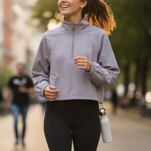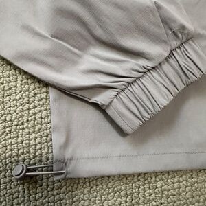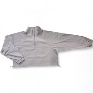 So cute and easy wear half-zip cropped long-sleeved gathered-wrist poly and spandex women's size L athlesure jacket. Elastic side pulls allow you to gather and ruche for extra style! Mushroom or taupey grey with matching zipper and pull.