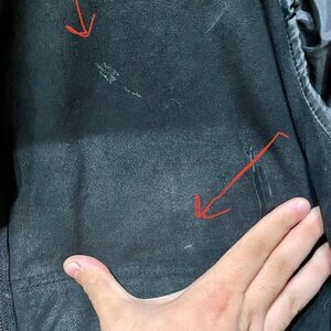 100% goat leather. Leather specialist clean only. Front asymmetrical zipper closure. Long sleeves with contrast rib-knit panels. The interior of this motorcycle jacket has teeny scratches/markings from trying on and zipper rubbing.