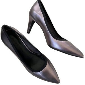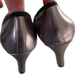 Worn once; Silvery grey (with a hint of pink) leather uppers; 2 3/4” heel; a couple of very faint marks on the backs (pic.6); smoke/pet free home. e-