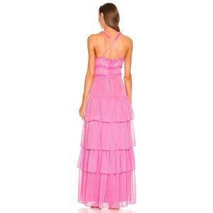 Likely Athena Maxi Dress in Pink Sugar. Size 14. Features plunge V-neck, sleeveless, adjustable back crisscross straps, raw-cut ruffle trims, tiered ruffle skirt, side slit, hidden back zipper closure, maxi length, and lightweight georgette fabric with subtle lurex threading throughout. Style YD12085206Y. 97% Polyester, 3% Lurex. Excellent condition, no flaws.