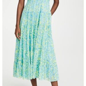 This maxi skirt by Likely showcases a stunning blue and green palette, perfect for resort wear. Its A-line silhouette is enhanced by a smocked waistband and tiered layers, offering both comfort and style. The skirt's airy fabric and elegant drape make it a versatile choice for casual outings.