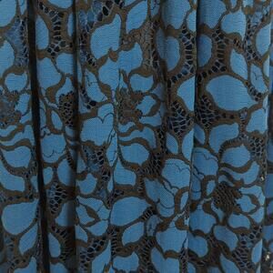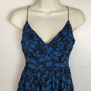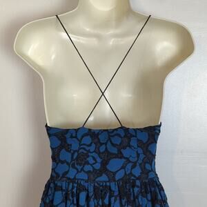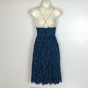 Blue flowers lined with black lace. A-line skirt. V neck. Spaghetti straps that cross in back. Fully lined. Hidden side zip. The interior straps that are meant to hold the dress on a hanger have been removed. There is one discolored spot under the right arm toward the back (please see photos). The rest of the dress is in excellent condition. Pit to pit measurement: 15.5 inches. Laid flat waist measurement: 13.5 inches. Length shoulder to hem: 41 inches.