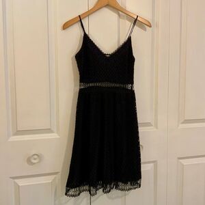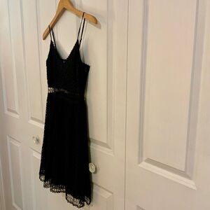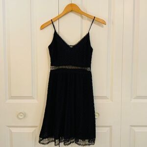 This Likely Glencoe Fence Lace dress is a standout, featuring a sleeveless cut, exposed waist, and mini length. The blue-black color gives it an edgy vibe, perfect for evening events. Size 0.