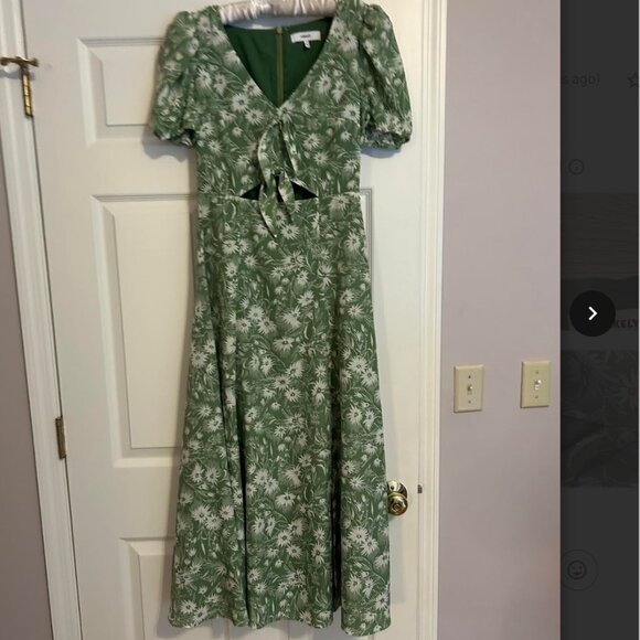 This is a Likely size 2 dress. It is green with a white floral pattern. It has a cutout and ties on the front, and a slit. It has some normal signs of wear and tear since it has been loved, like the slit on the side has some threads showing, but overall, it is in great shape!