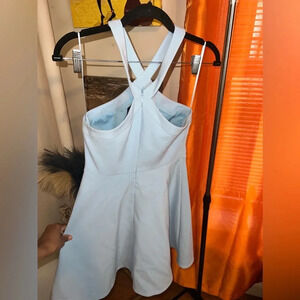 Sky blue Likely dress size 2. Zipper back, skater bottom. Looks like a very tiny Knick on the under the arm. I took a photo, it’s hard to tell because it’s tiny.