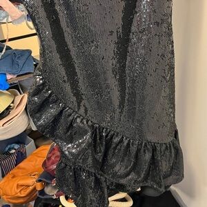 Sexy sequin dress with gorgeous structured ruffles and fitted bodice. Hidden back zipper, elastic strip holds the top up. One thread loosened (see pix) but doesn't look like any sequins have come off. Worn once to Eras tour.