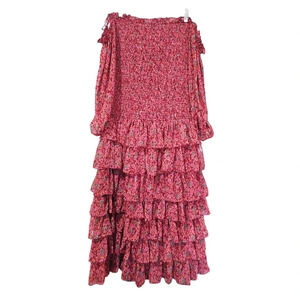 Likely Mitzie Midi Dress in Tibetan Red Multi. Size 6. Features off-the-shoulder neckline, long blouson sleeves, smocked bodice, tiered ruffle hem, side slit, floral print, lined, fit & flare silhouette, and midi length. Style YD15284614Y. 98% Polyester, 2% Lurex. Excellent pre-owned condition, no flaws.