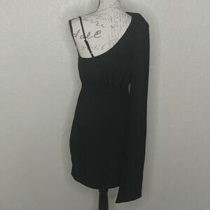 Likely black dress with one side cape detail and one adjustable spaghetti strap. Dress has a left side zipper closure. Size 4. Please see approximate measurements below.