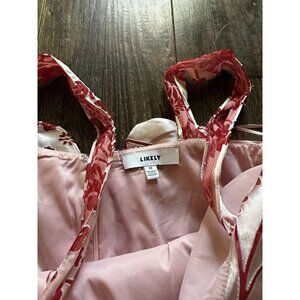 Likely Revolve Pink Floral Midi Trumpet Dress Ruffle Top Size 10. Excellent condition, very slight darkening around the armpits. Amazing LIKELY quality, perfect for any wedding, wedding guest, event, part, evening, etc