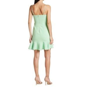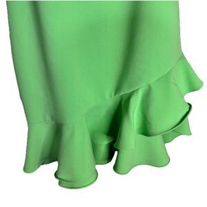 The dress has a solid green color and an asymmetric design that is both unique and stylish. The knee-length dress is perfect for a wedding, prom or party/cocktail event, and the short dress length adds a touch of fun and playfulness. The dress is available in size 6 and is suitable for regular-sized women.