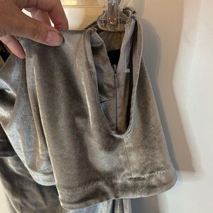 Stylish strapless velvet form fitting dress in shimmering silver. Fully lined, side zip, sticky strap across inside.