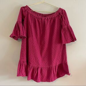 Stunning raspberry dark pink off the shoulder mini dress from Likely, size 2. Featuring adorable bell sleeves, ruffle hem, off the shoulder neckline, and is fully lined. Excellent preworn condition with perhaps minor wash wear/slight fading noted to the fabric throughout. Please see all photos/video above. Any questions please ask ✨
