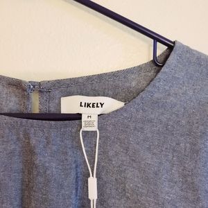 This chambray, 100% cotton, bell sleeve, front tie top by Likely is New With Tags and in new condition. Size medium. Chest width is approx. 19' and total length is approx. 20" at longest and 15" around the tied area.