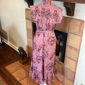 The Levine Dress features a flowy fit and flare design and an elegant high neckline with a sleeveless touch.