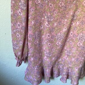 Details: mini ruffle flower pastel colored dress, Lightweight crepe Covered, elastic at shoulders, Tiered ruffles at hem Floral print Mini-dress cut, Notched scoop neck with structured wire V insert, Long sleeves with covered elastic and ruffle detail at cuffs, Hidden zipand hook-and-eye closure at back, Partially lined