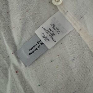 White shirt with colorful speckles. Lightweight fabric- 99% cotton. Fits like an XS/S.