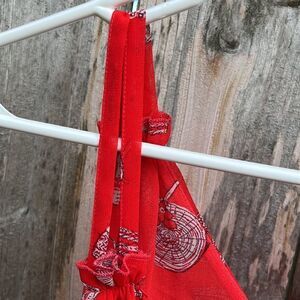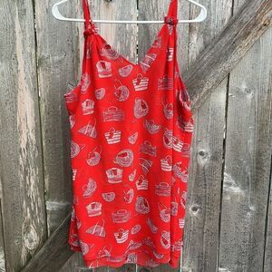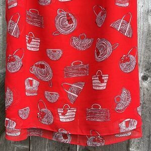 Like new; Red with straw bag pattern; self lined; pit to pit measures approx. 21” across; smoke/pet free home. c-