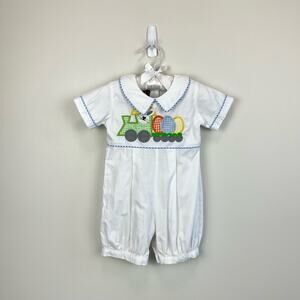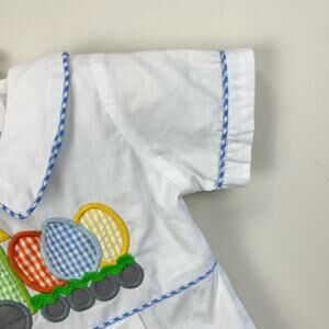 Lil Cactus Applique Easter Bunny Shortall Romper. Baby boy size 6-12 months. Dressy white one piece collared outfit. Adorable pastel gingham plaid train with eggs and a bunny rabbit on the chest. Features pleats and piping. Buttons in the back and hidden snaps at the bottom. Excellent condition!
