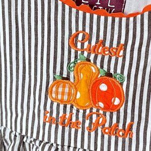 Lil Cactus Baby Girls Pumpkin Patch Dress/ Jumper- Size 12-24 months. Absolutely adorable! Brown and white striped background with Cutest in the Patch embroidered detail on front. Scalloped trim and tie in the back. In excellent pre-owned condition.