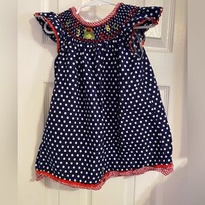 Navy blue with white polka dots dress with smocked collar and flutter sleeves