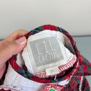 Lil Cactus Smocked Plaid Christmas Tree Dress. Toddler girl size 2T. Festive holiday plaid pattern with embroidered Christmas trees and plaid fabric bows at the beck. Fun ric rac ribbon detail on the flutter sleeves and skirt. Buttons in the back for easy on/off.