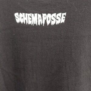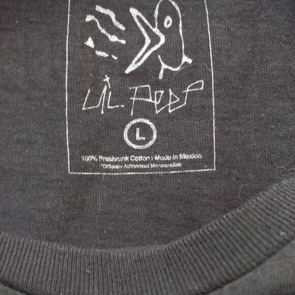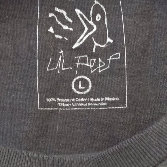 Lil Peep Schemaposse OG Skeleton Grim Reaper T-Shirt Large (L) Official Merch. 100% Cotton. Official Merch tag on back in Pink Lower Center of shirt. Marked L. Actual approximate measurements pit-ip-[it 21", Waist side to side 22", rear nape of neck to bottom length of garment 29.5". Nice medium weight thicker ply cotton. Minimal fading of the black material.