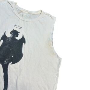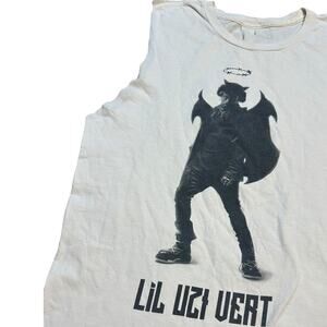 White cut-off tee featuring Lil Uzi Vert graphic with demon wings and barbed wire halo design. Yellowing near armpit—could be cut further for a cleaner look. Wear noted, good condition.