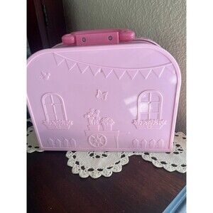 Gently used adorable little carrying case with a cute bedroom inside equipped with bunk bed ladder, toy box, toys and lamp.