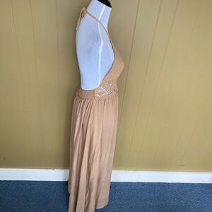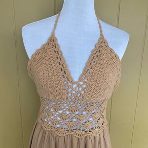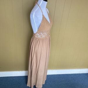 Lil better women M brand new open back maxi dress w/halter crochet top tan