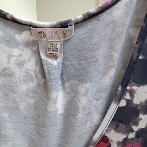 Lily Rose ladies Two floral abstract pattern with colors of Gray blue, white and red These are not vibrant colors they are muted. Oversized in length would be ideal for leggings or blue jeans