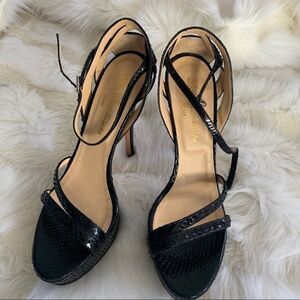 Ultra sexy sky high stilettos by high end designer Lila castellaneta. Black snakeskin style leather with strappy design. Accent to the ankle is present only on one shoe. Overall great preowned condition (worn couple of times) with some wear to soles and insoles and again missing one of the ankle charms. Heel height approx 5.25” with 1” platform
