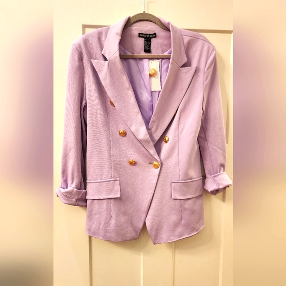 Lilac Blazer with gold button detail.