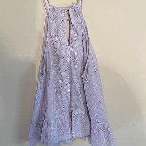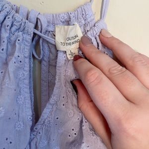 Light and airy lilac top with eyelet detail. Ruffle at the bottom and totally adjustable straps at the top that can be tied. Looks super cute with high waisted jeans or shorts!