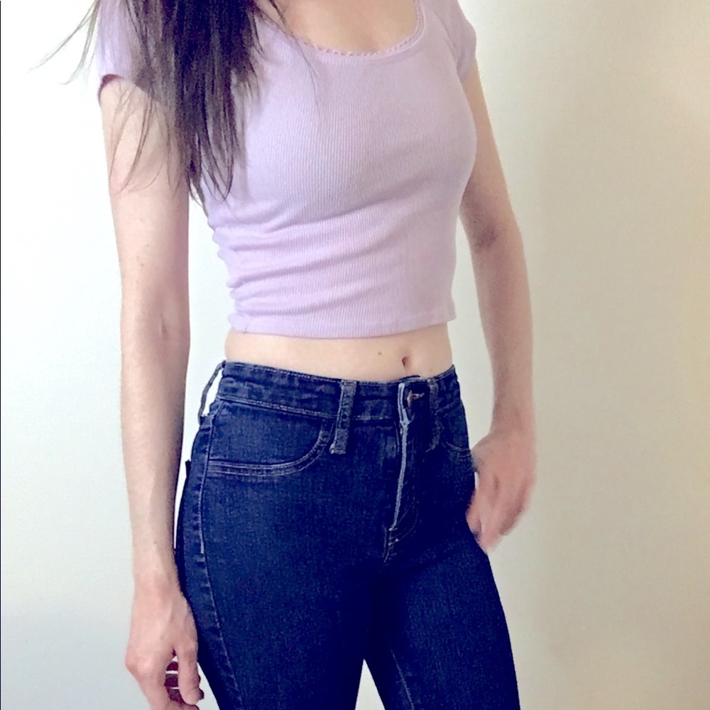 This soft, short sleeved crop top is hand wash only. It has a scalloped trim along the neckline. I can provide more images and measurements as needed.