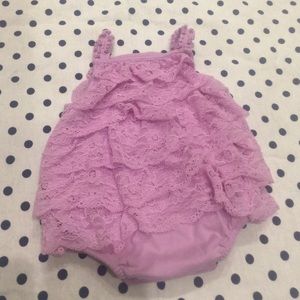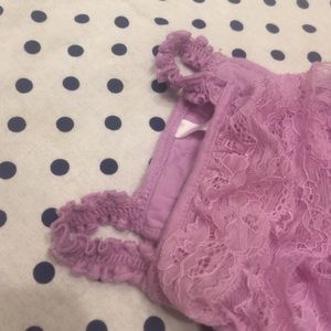 Lilac layered lace bodysuit with elastic shoulder straps.