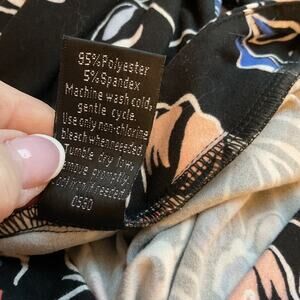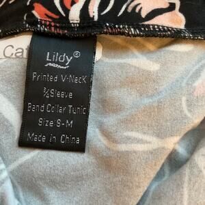 The Lildy Black Floral 3/4 Sleeve V Neck Collar Striped Hem Dress/Tunic in size S is a versatile and stylish option for women's clothing. Made from a comfortable blend of polyester and spandex, this machine washable garment is perfect for casual occasions in all seasons. The multicolor floral pattern, V-neck collar, and 3/4 sleeves give it a feminine and trendy look, while the regular fit ensures a comfortable and flattering silhouette. Perfect for adding a pop of color and style to your wardrobe, this dress/tunic from Lildy is a must-have for any fashion-conscious individual.