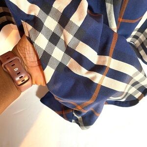 It features a bold navy plaid pattern with shades of tan, white, and rust—perfect for pairing with leggings, jeans, or boots.