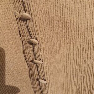 This Lili Butler beige long sleeve blouse has lovely matching button front and an attractive ribbed silk material. The ribbing and the 2 long slits on the sides makes this blouse unique looking. It would look great over your skirt, slacks, or jeans. Size: small, approximate measurements taken flat: pit to pit 16“, top of neck to bottom 34“, inside sleeve 15“, outside sleeve 20“. Good preowned condition, no rips, or tears. If you see a problem that I have missed, please let me know because I promise to take care of the problem. I am not going to let you be unhappy. Have a question, just ask. Have an offer, make it.