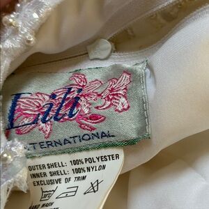Stunning white wedding dress with intricate lace details. Features long sleeves and a flowing skirt. This is vintage guessing 80s. There is no size on it. The measurements are as follows: 16 inches across the front from pit to pit; 13 inches across the front at the waist 18 inches across the front at the hips; armpit to the drop waist is 21 inches and from the drop was to the hem is 21 inches in the front. The dress does have some stains on the shoulder and along the inside of the train as well as the one pictured on the front of the dress. That is on the lace detail.