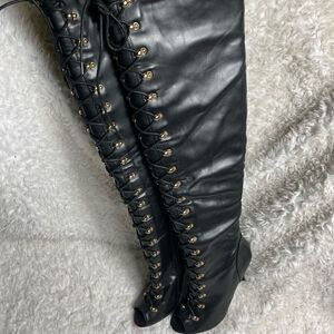 Liliana Boho-10 Black faux leather thighs high lace up heel boots peep toe Gold tone hardwares Size 8 .Pre owned in good used condition normal wear clean