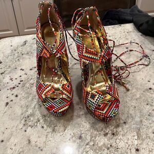 Liliana Funky Bright Geometric Ankle Tie Wedge Sandals sz 8 NWOT