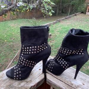 Liliana Glam Gold Studded Black Faux Suede Open Toe Ankle Boots 5" Heel Size 9