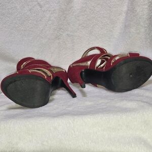 These stunning red w/ gold metallic trim 4" heels from Liliana feature an intricate cage-like design with crisscrossing straps and metallic buckle enclosures. The tall, slender stiletto heels and open-toe design make them perfect for formal occasions, parties, dates, etc. while the suede-like material adds a touch of sophistication. These versatile shoes can be worn even to dress up a pair of jean, anything you choose to rock them with... they will EASILY dress it up and make it stand out!