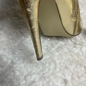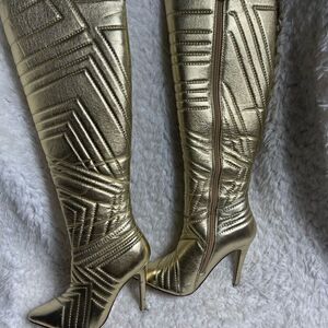 Liliana Metallic Gold Quilted Patterned Stitch Pointy Toe Stiletto Boots size 6.5 side zipper 4.5” heels.pre owned in good used condition the heels have some scuffing and some peelings on the front area not noticeable when wearing see all pictures any questions please message.